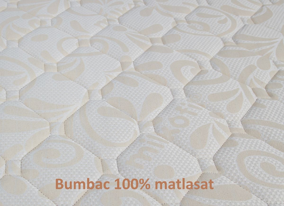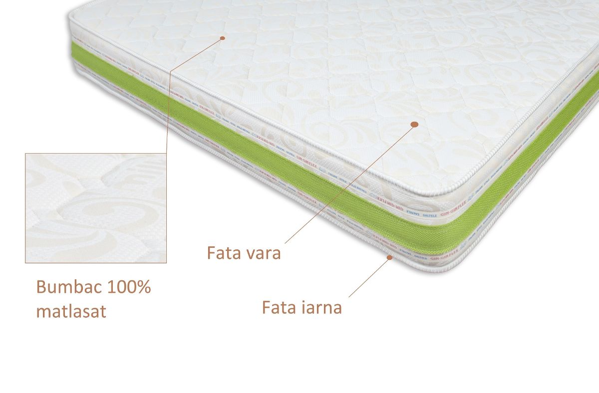 Ambele fete ale saltelei sunt confectionate din bumbac 100% matlasat, putand fi folosite atat pe perioada de iarna cat si cea de vara. Fata de vara a saltelei este realizata din bumbac, cu o densitate mai mica a fibrelor, permitand astfel circulatia aerului. Fata de iarna este mai bine izolata, realizata cu o densitate crescuta de fibre de lana si bumbac, doua materiale cunoscute pentru calitatile lor de a retine aerul cald.