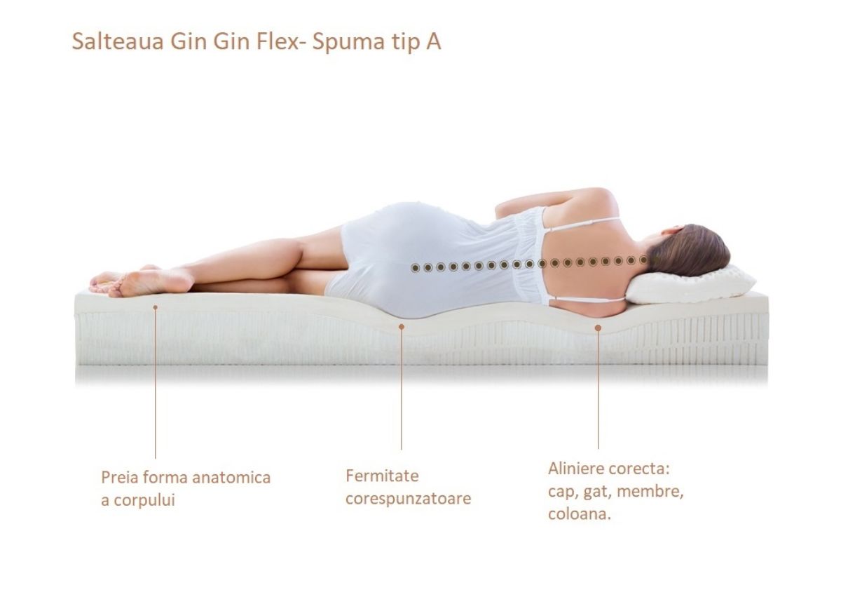 Salteaua super ortopedica Gin Gin Flex SPUMA TIP A, ofera cel mai bun raport calitate pret din categoria saltelelor pe baza de spuma, datorita volumului marit si a calitatii materialelor utilizate.